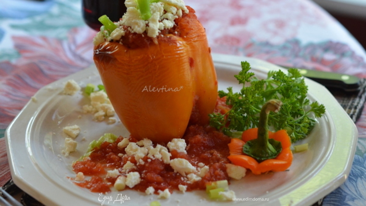 Посыпать готовые перцы фетой и зеленым нарезанным луком. Подаем к столу. Приятного аппетита.