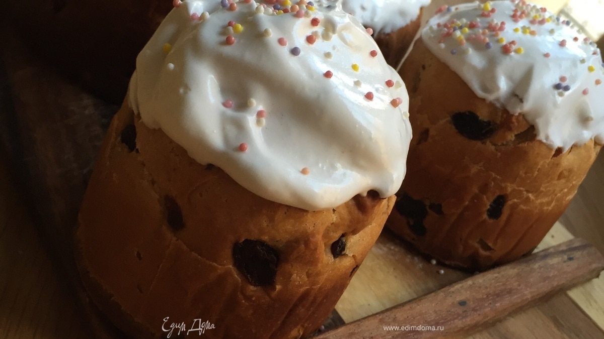 Для белковой глазури взбиваем холодный белок с щепоткой соли до хороший пиков. Потом по ложке добавляем сахарную пудру и продолжаем взбивать до нужной консистенции. Наносим глазурь на остывший кулич, украшаем! Уфф, работа проделана, можно наслаждаться.