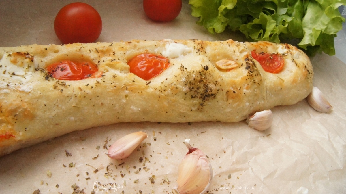 Доску опять присыпать мукой, переложить тесто, разделить его на 4 части. Я делала это силиконовой лопаткой. Слегка растягивая тесто, перенести 4 батончика на смазанный маслом противень. У меня получились не очень ровненькие, но на вкус это не повлияло. Начинка для такого может быть любой. Я порезала помидорки черри на четвертинки, чеснок слайсами, фету кубиками. Распределить начинку поровну между хлебом. Смазать каждую стекку кисточкой оливковым маслом (у меня растительное). Если не используете фету, то присыпьте морской солью. По вкусу присыпьте прованскими травками. Пока духовка разогревается, стекки немного подойдут. - Шаг 5