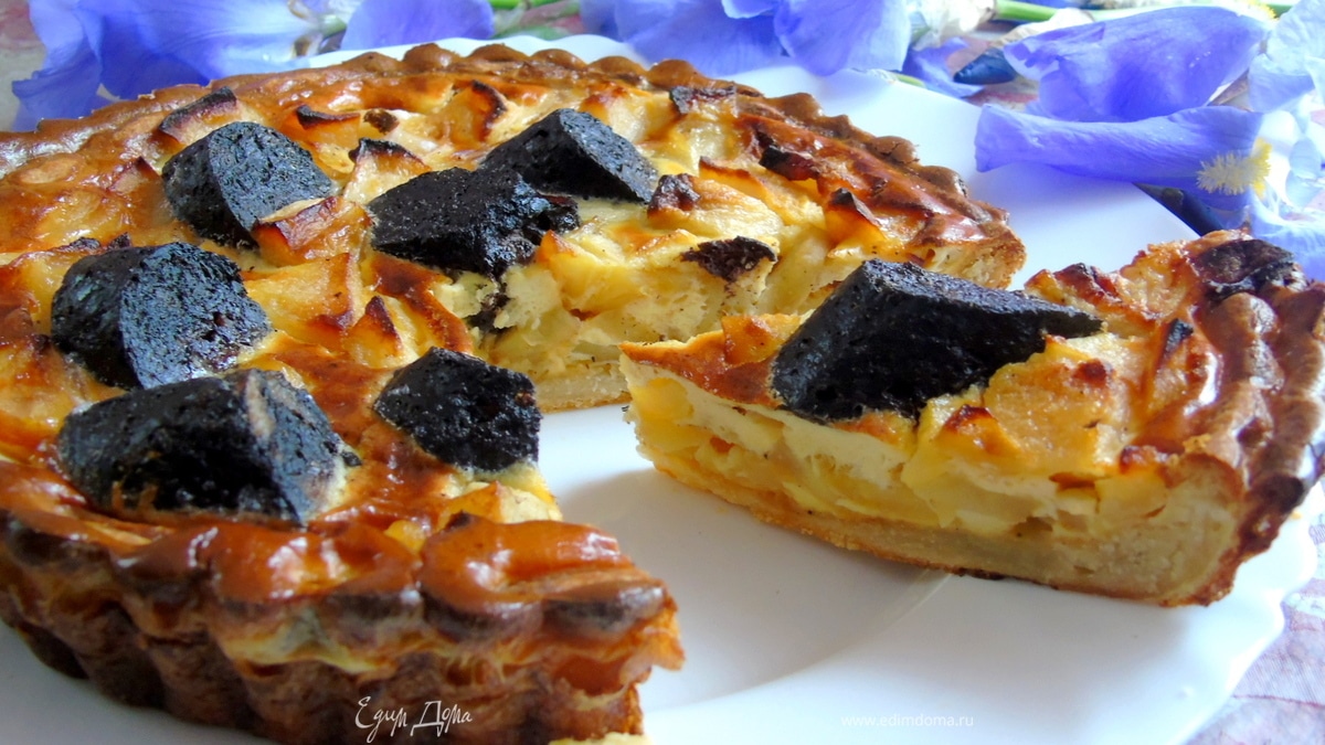 Boudin Noir — это кровяная колбаса, дословно переводится «черная колбаса». Традиционно ее готовят в Бельгии (но и у нас не диковинка) и подают с картофельным и яблочным пюре, или просто с жаренными яблоками, а так же тушенной красно-кочанной капустой. Вообщем сочетание яблок и кровяной колбасы — это классика и встречается оказывается довольно часто)))) Сочетание яблок и печенки я очень люблю, поэтому увидев этот рецепт загорелась его сразу приготовить: от вкуса я осталась ооочень довольна, режется прекрасно, даже горячим, короче одни плюсы!!! Диаметр тарта 18-20 см.