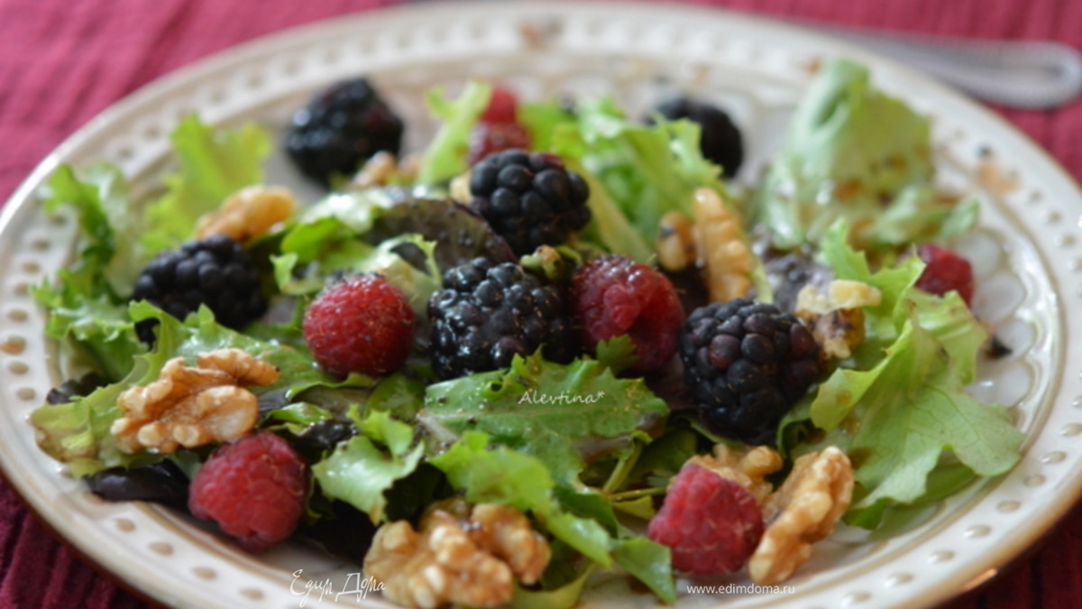 На тарелки разложить салатную смесь из свежих листьев салата. Орехи можно подсушить. Ягоды помыть, добавить в тарелки. - Шаг 2