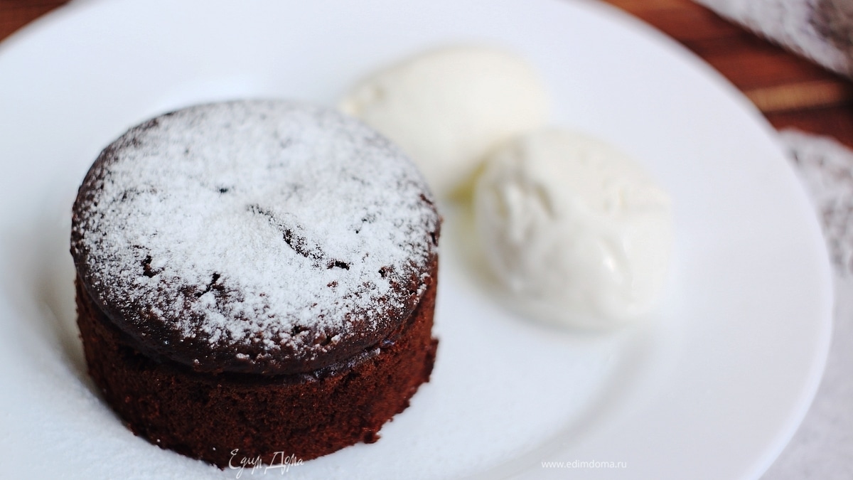 Вынуть фондан из формочек, добавить по шарику ванильного мороженого, подавать десерт горячим. Приятного аппетита!