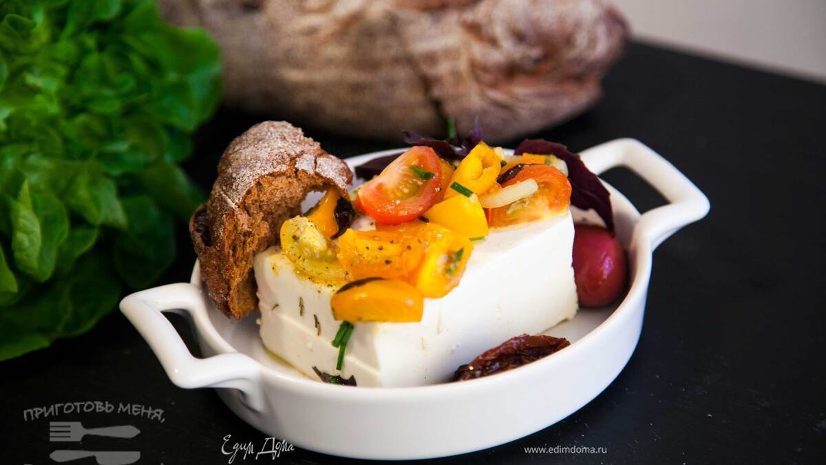 В форму для запекания положить сыр, сверху выложить овощи, вяленые томаты, оливки. - Шаг 4