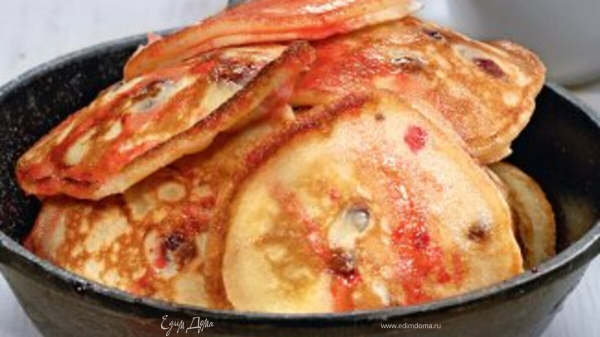 Просеять муку и разрыхлитель в миску, добавить сахар и соль. Взбить яйцо с молоком и влить получившуюся смесь в муку. Добавить сливочное масло и тщательно размешать до однородности. Клюкву промыть, обсушить и аккуратно смешать с тестом (вместо клюквы можно использовать замороженную черную смородину, но блинчики будут с кислинкой). Пожарить в разогретом растительном масле небольшие блинчики. При подаче на стол можно полить ягодным сиропом или вареньем из клюквы.