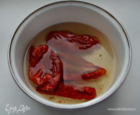 Вяленые помидоры замочить в подсоленной воде на 15-20 мин. Затем вынуть из воды и мелко порезать. Воду пока оставить.