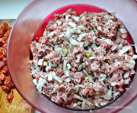 Укроп мелко порезать и вместе с вялеными томатам добавить к фаршу. Вбить яйцо и перемешать. Посолить, поперчить, добавить крахмал и хорошо вымесить фарш. Во время вымешивания можно добавить 2 ст л воды от замачивания помидор.