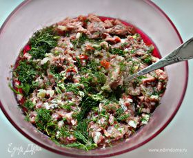 Подготовить фарш. Я использовала 2/3 говяжьего + 1/3 свиного фарша. Сало порезать на маленькие кусочки и добавить в фарш.