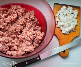 Лук мелко порубить, чеснок пропустить через пресс и добавить в фарш.