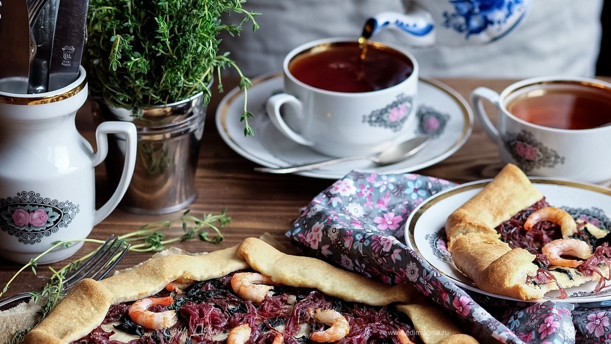 Духовку нагреваем до 205°C. Тесто раскатываем в круг примерно 30-40 см и толщиной около 3 мм. Тесто очень эластичное и работать с ним одно удовольствие. В центр галеты укладываем равномерно шпинат. На шпинат — луковый мармелад. На него — очищенные креветки. Заворачиваем края галеты внахлест. - Шаг 5