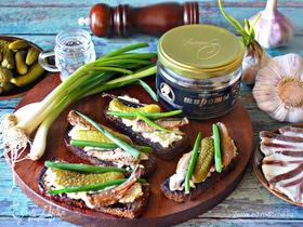 Чередуя через один, нанести на другую сторону хлеба ровным слоем начинку из семги... Накрыть вторым ломтиком так, чтобы сторона с огурцами была снаружи. - Шаг 5