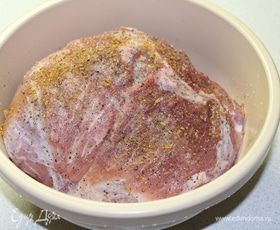 Мясо промыть, высушить салфеткой. Натереть солью, перцем, любимыми пряностями. Накрыть и на пару часов поставить в холодильник (но даже если вы упустите этот момент, ничего страшного).