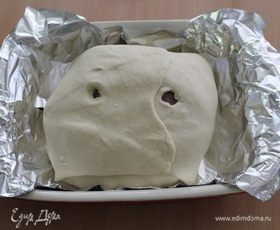Мясо конвертом завернуть в тесто, сделав пару отверстий. Выложить мясо на фольгу в смазанную сливочным маслом форму.
