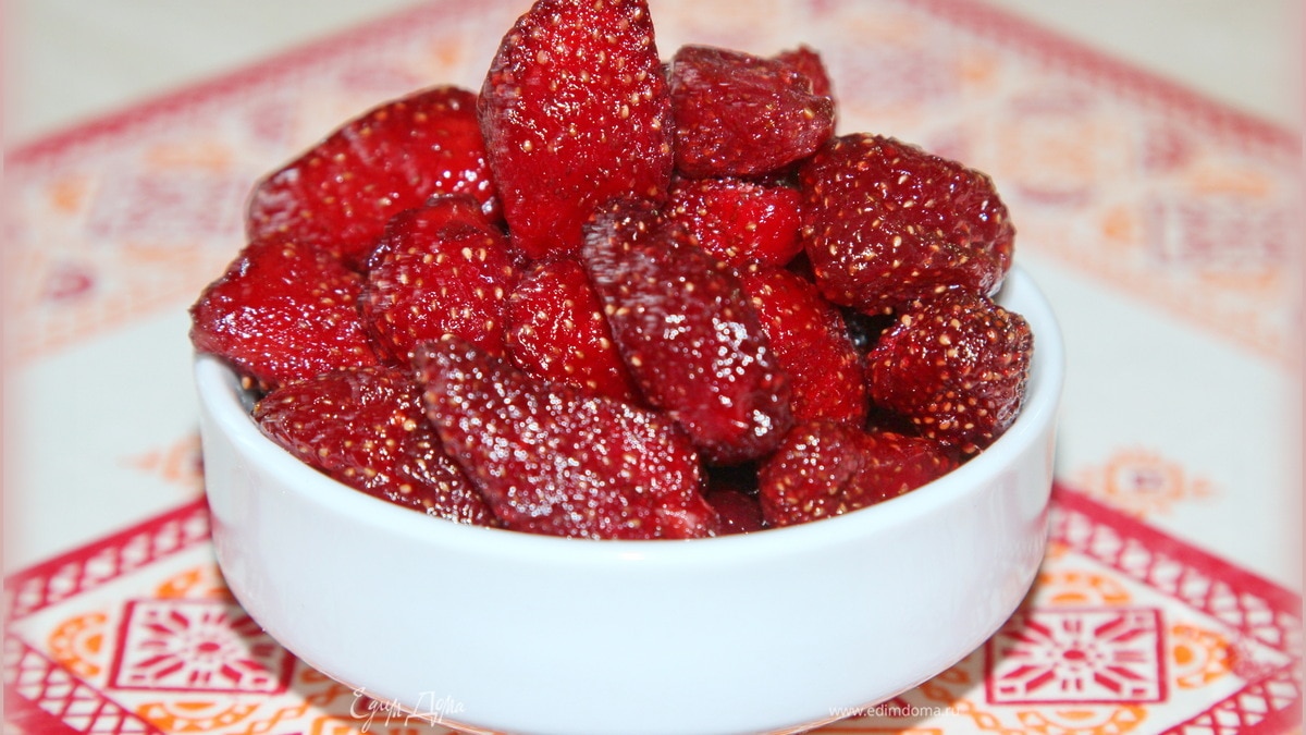 Сегодня хочу предложить вам необычный рецепт, как я и люблю. Готовлю такие цукаты каждый год, но вот сфотографировать процесс все было недосуг. Ну вот — сбылось! Рецепт из серии «придется повозиться», но резульатат того стоит. Особенно тем, кто занимается изготовлением тортов и различной выпечки на продажу. Да и для себя любимой: зимой вместо конфет — милое дело. Для тех у кого собственная клубника и хочется испробовать что-то новенькое — добро пожаловать. Рецепт не хлопотный, но продолжительный во времени: у меня на это уходит, при солнечной погоде, ровно неделя. Вот эту порцию я уже упрятала в морозильную камеру (можно просто в холодильнике), а вторая порция сегодня отправится сушиться и я сразу закладываю третью: клубника у нас этом году уродила, так что запасусь. Из 1,5 кг получается 350 грамм цукатов. Если начинать делать в выходные дни, то за 1,5 дня можно пропитать клубнику сиропом, а потом уже сушка: либо в духовке при температуре 90°С — часов 8, либо так как я — на доске и пусть сама сохнет на застекленном балконе. Мне так больше нравится. Затем цукаты можно пересыпать сахаром и хранить в плотно укупоренной посуде, в прохладном месте. Я раскладываю в небольшие контейнера по 150 грамм и храню, если есть возможность, в морозильной камере, если нет такой возможности — в холодильнике. Ну, и бонусом мы еще получаем чуть больше 0,5 л насыщенного, тягучего и безумно ароматного клубничного сиропа, с которым не сравнится никакой покупной. Его тоже можно использовать для пропитки бисквитов, в каши, в десерты, да мало ли куда... Как говорится — был бы сироп, а проблему мы себе сами найдем! Я, например, и в кофе добавляю, как топинг. Ну, кажется все рассказала, ничего не забыла...