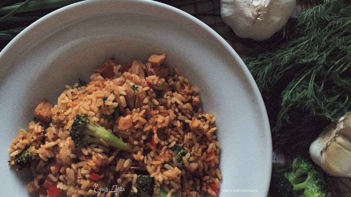 Жареный рис с овощами и курицей