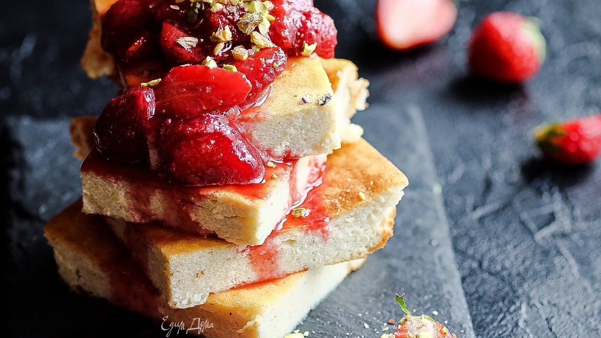 Творожная запеканка с ванилью, клубничным соусом и фисташками