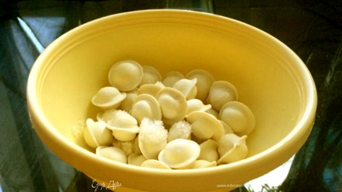 - Шаг 6Пельмени опускаем в кипящую соленую воду, периодически помешиваем, а после того как они всплывут, варить около 5 минут.