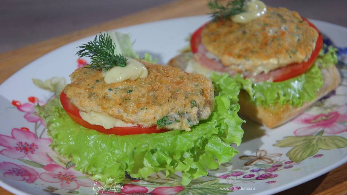 Обжаренный хлеб сбрызнуть оставшимся оливковым маслом, разложить на него листья салата, кружки помидора, посолить, поперчить, смазать домашним майонезом, сверху поместить рыбные котлетки, еще немного смазать майонезом и украсить оставшимися веточками укропа.