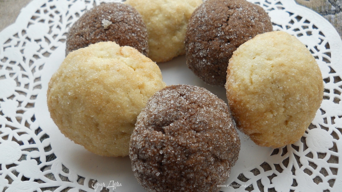 - Шаг 2От теста отщипывать кусочки, внутрь начинка, скатать шарик. Обвалять шарик в сахаре.