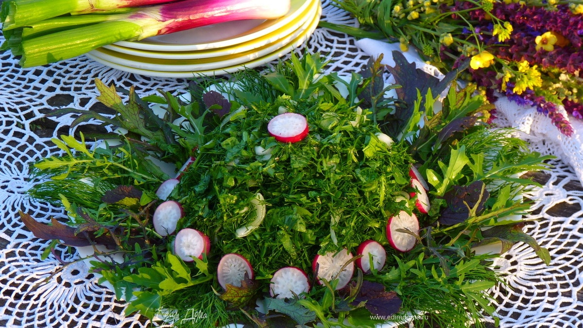 , варьировать можно по вкусовым предпочтениям. Ранней весной добавляю листья салата, летом — кинзу (что выросло на грядке