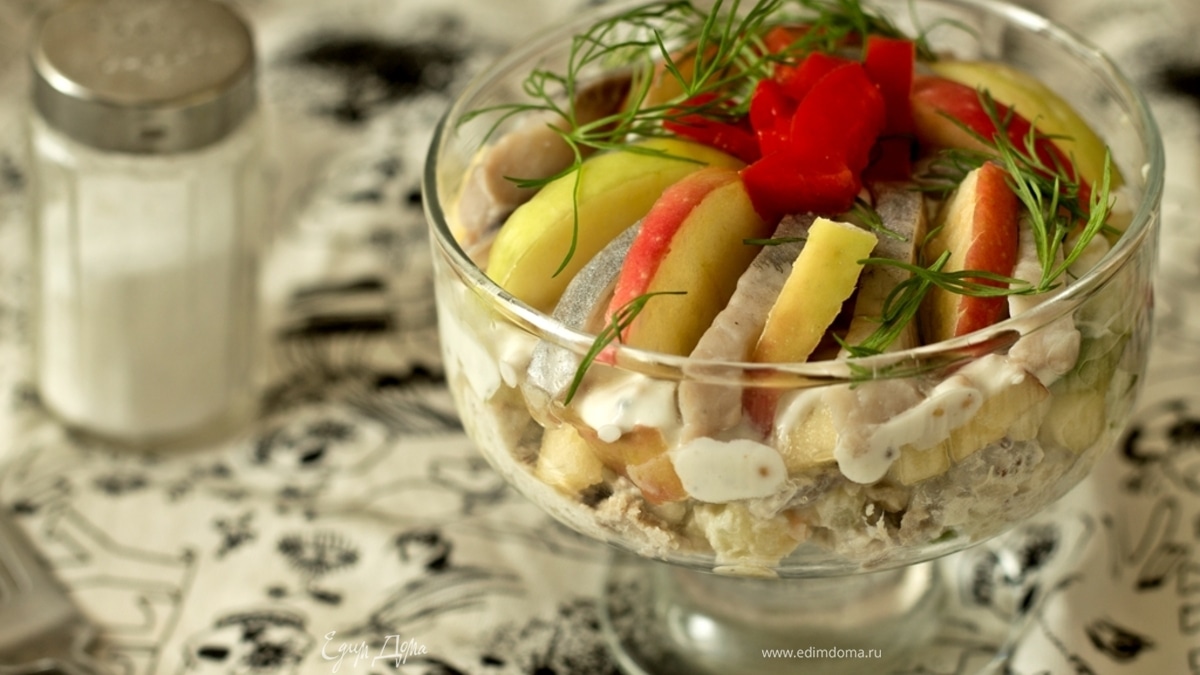 Сервируем порционно, украшаем яблоком, сельдью и зеленью.