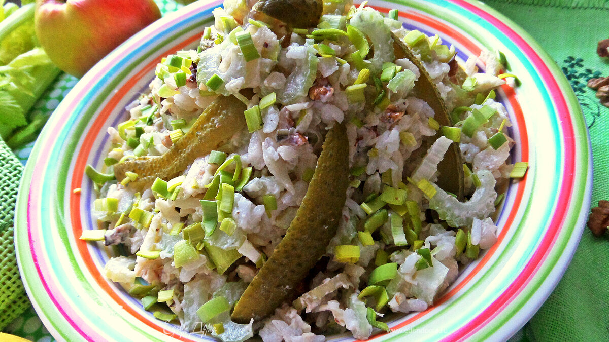 Для любителей хрустящих салатиков полезный, вкусный вариант. Орешки и сыр сделают его не скучным, а рис прибавит сытости)))