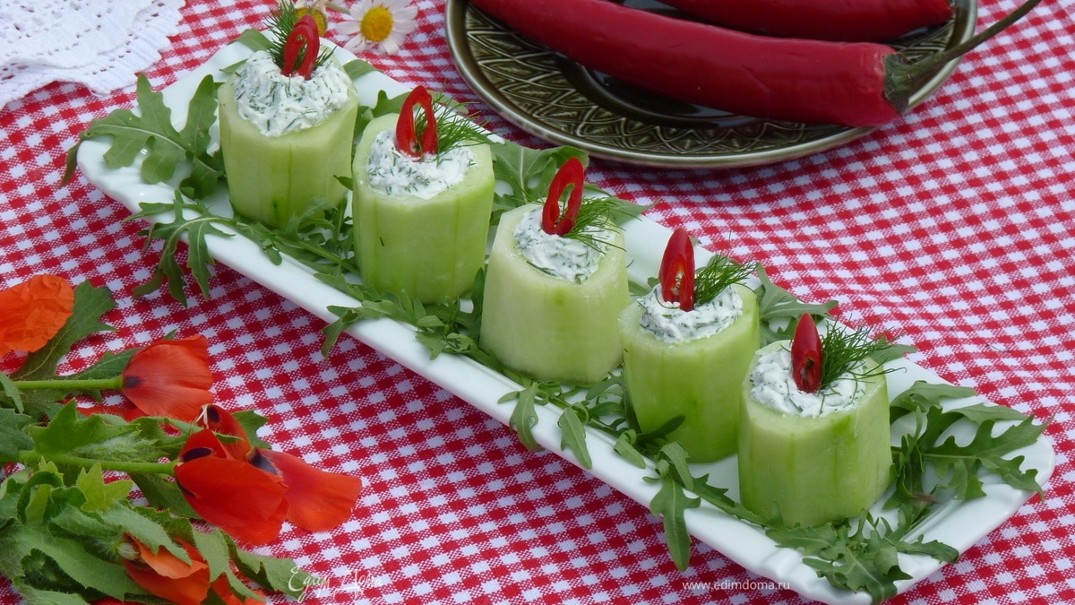 Легкая летняя освежающая закуска. Рецепт давно увидела в журнале, использую его часто, лишь немного откорректировав... Эти огуречные «свечи» эффектно смотрятся на столе и очень быстро исчезают...