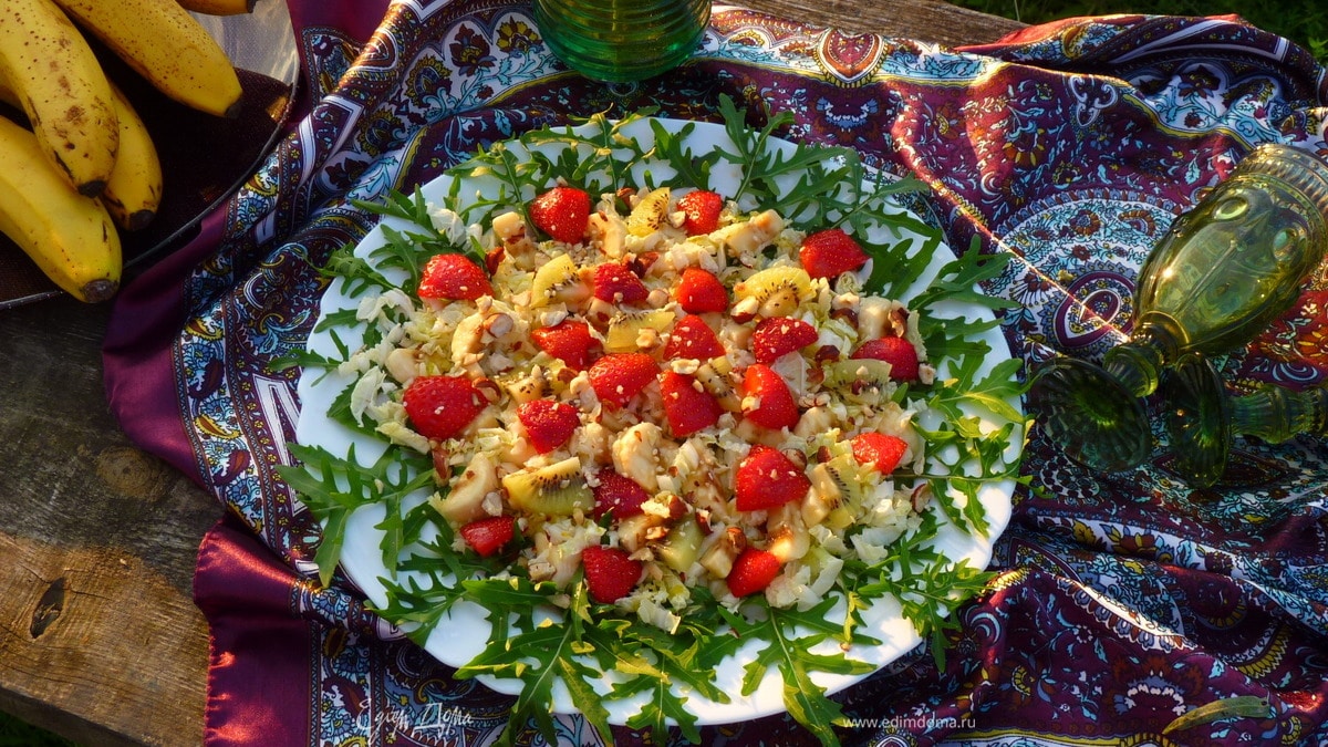 Рецепт подсмотрела в журнале, немного изменила, приготовила для подружек. Салат легкий, имеет неожиданное (для меня) сочетание. Из указанных продуктов получилось два блюда. (Девочки привезли шампанское...