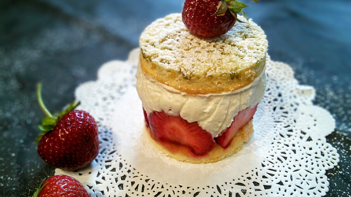 Украшение у меня скромное — это сахарная пудра, совсем чуть-чуть и клубничка. Пирожное смотрится и так очень симпатично :) - Шаг 16