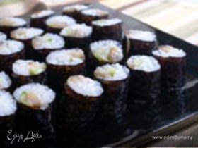 Приготовить рис для суши можно по собственному рецепту. Я готовлю так. Полчашки риса тщательно промыть через сито и в нем же отложить на 15 мин. Потом высыпать рис в кастрюлю с толстым дном, влить воду (2/3 чашки), накрыть крышкой и варить на сильном огне в течение 1 мин. Затем огонь уменьшить до минимального и варить еще 18-20 мин., не открывая крышки. Проверить, сварился ли рис, и накрыть снова крышкой. Огонь выключить. Тем временем приготовить заправку для риса. Для этого смешать рисовый уксус, соль и перец (можно добавить 1 ч.л. воды). Готовую смесь добавить к рису, перемешать.