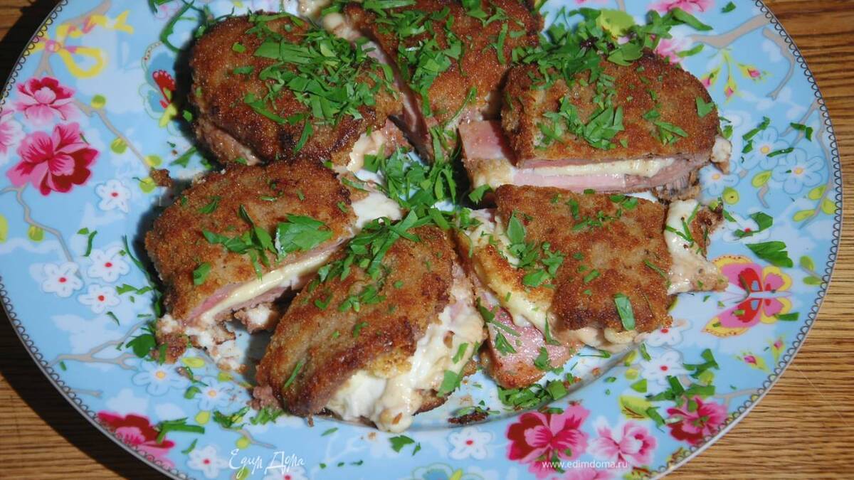 Петрушку мелко порубить и посыпать готовые эскалопы.