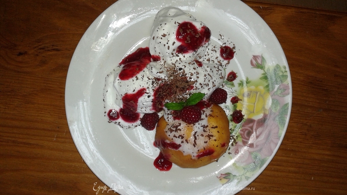 - Шаг 3Полить мороженое и персик остывшим малиновым соусом.