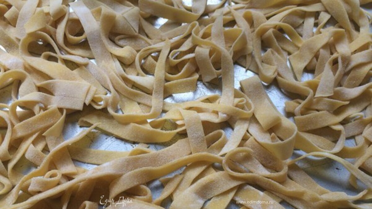 - Шаг 5Если у вас есть машинка для пасты, Вам будет значительно проще) У меня ее нет, я раскатывала вручную, скалкой. Нужно посыпать рабочу поверхность мукой. Тесто разделить на 4 части. Скалку можно также посыпать мукой. Начинайте раскатывать скалкой по направлению от себя ,все время поворачивая получившийся пласт. Раскатывайте пока пласт не станет тонюсиньким, как например на штрудель. И можете нарезать пасту той формы, какая вам нравится. После посыпьте хорошо пасту мукой. Паста должна подсохнуть. Я варила сразу, а остольное выложила на поднос (не забывайте посыпать пасту мукой). Хранить можно неделю.