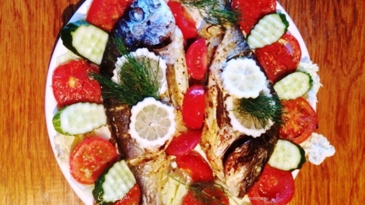 Вкусная рыба, запеченная в духовке на подушке из помидор, с минимумом специй.