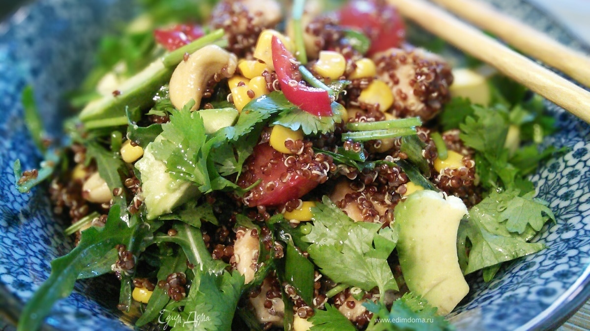 Специально в инете нашла информацию, что за зверь такой киноа. Теперь в магазинах буду искать — оказывается, очень полезная штука. Для лета — полноценный обед.😋 И любимую кинзу вижу на фото.