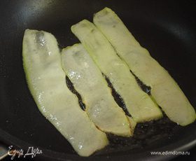 Кабачки нарезать тоненькими пластинками и обжарить на растительном масле до комфортной вам степени прожарки.