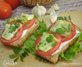 Кусочки хлеба подсушить в тостере (по желанию), намазать сметаной, выложить кусочки помидора, сверху кабачок и присыпать зеленью. Я еще сбрызнула оливковым маслом, настоянным на чесноке и остром перце. Поверьте, очень просто и вкусно!