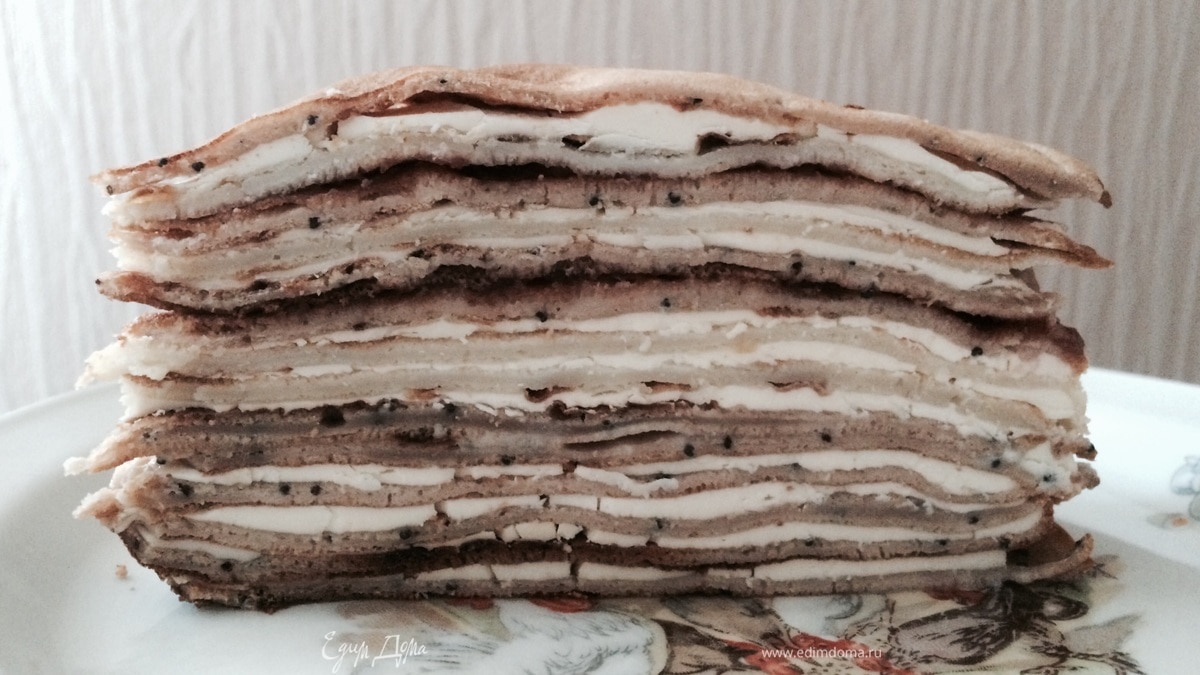- Шаг 3Собираем торт: выкладываем блинный треугольничек на тарелку и смазываем мягким творогом, сверху кладем следующий блинчик и слой сгущенки. Продолжаем укладывать блины и промазывать их кремом, чередуя.