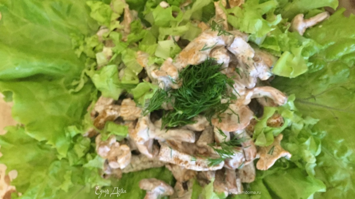 Выложим листья салата, в центр положим грибы с сухарями и украсим зеленью (в моем случае порезанные листья салата и укроп). Блюдо я не подсаливала, так как грибы и сухари были достаточно солеными. Приятного аппетита!
