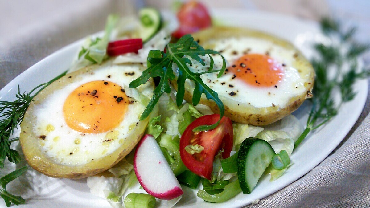 Яичницей в картофеле мы устроили себе замечательный ужин. К ней я приготовила салат из свежих овощей, а мой муж, кто бы мог подумать, порезал себе колбаски ![]()