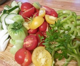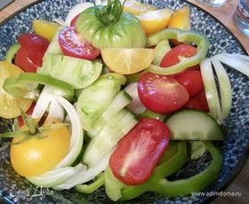 Помидоры желательно использовать разных сортов и цветов. Сейчас как раз сезон, и возможности не ограничены. Симпатично смотрятся даже бурые помидоры. Их нарезать в зависимости от размера на половинки, четвертинки и кружки. Лук очистить и мелко порубить. Оба вида перцев также нарезать, из перца чили извлечь семена и перепонки, регулировать остроту по своему вкусу. Я добавила в салат огурец.