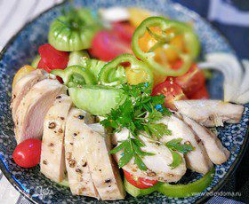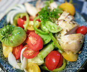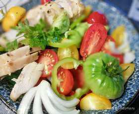 Здравствуйте! Хочу представить вашему вниманию несколько салатов, которые сами по себе являются полноценными питательными блюдами, не требующими никаких дополнений. Ну разве что кусочек свежего хлеба:) Сегодня это помидорный салат с куриным филе. Угощайтесь!