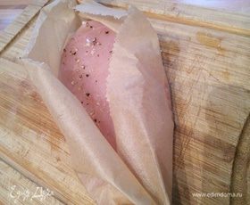 Куриное филе можно обжарить на масле, а также запечь в духовке. Я его помыла, обсушила, посолила, поперчила. Сделала карманчик из пергамента и запекала в духовке при 180°С около 35 мин. Я делала 1 порцию салата.