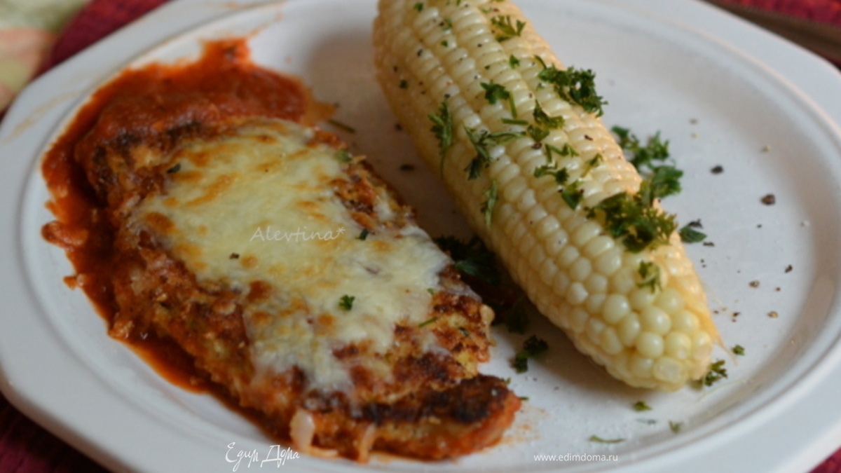 Посолить и поперчить куриные котлеты. Обвалять в яйце, затем в хлебной крошке с пармезаном.