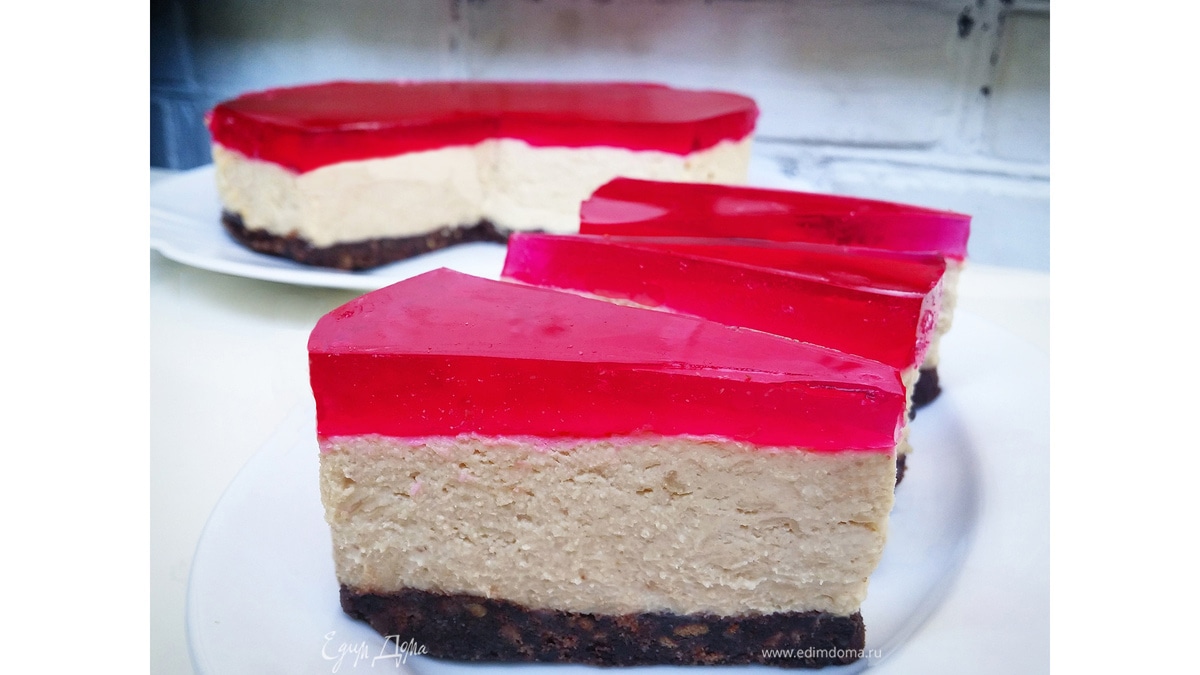 Автор предлагает украсить чизкейк растопленным белым шоколадом. Я решила залить его вишневым желе. Приятного аппетита!