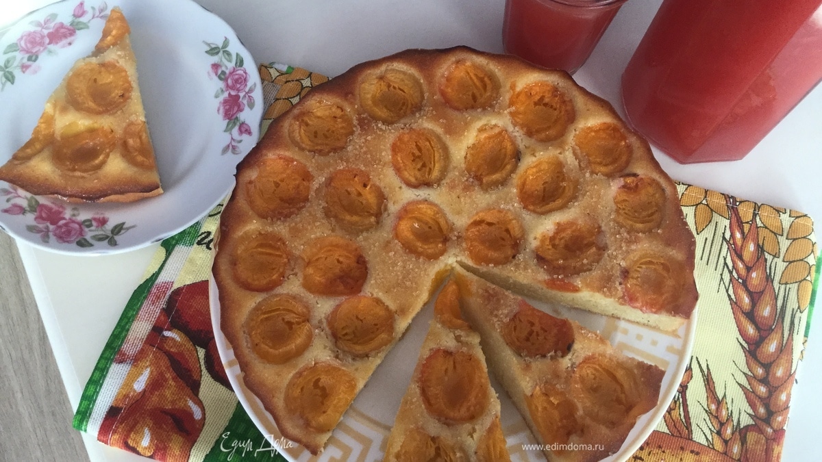 Форму диаметром 28 см смажьте маслом, вылейте тесто, выложите половинки абрикос, срезом вверх. Присыпьте пирог оставшимся сахаром и выпекайте в духовке 45 минут. - Шаг 5