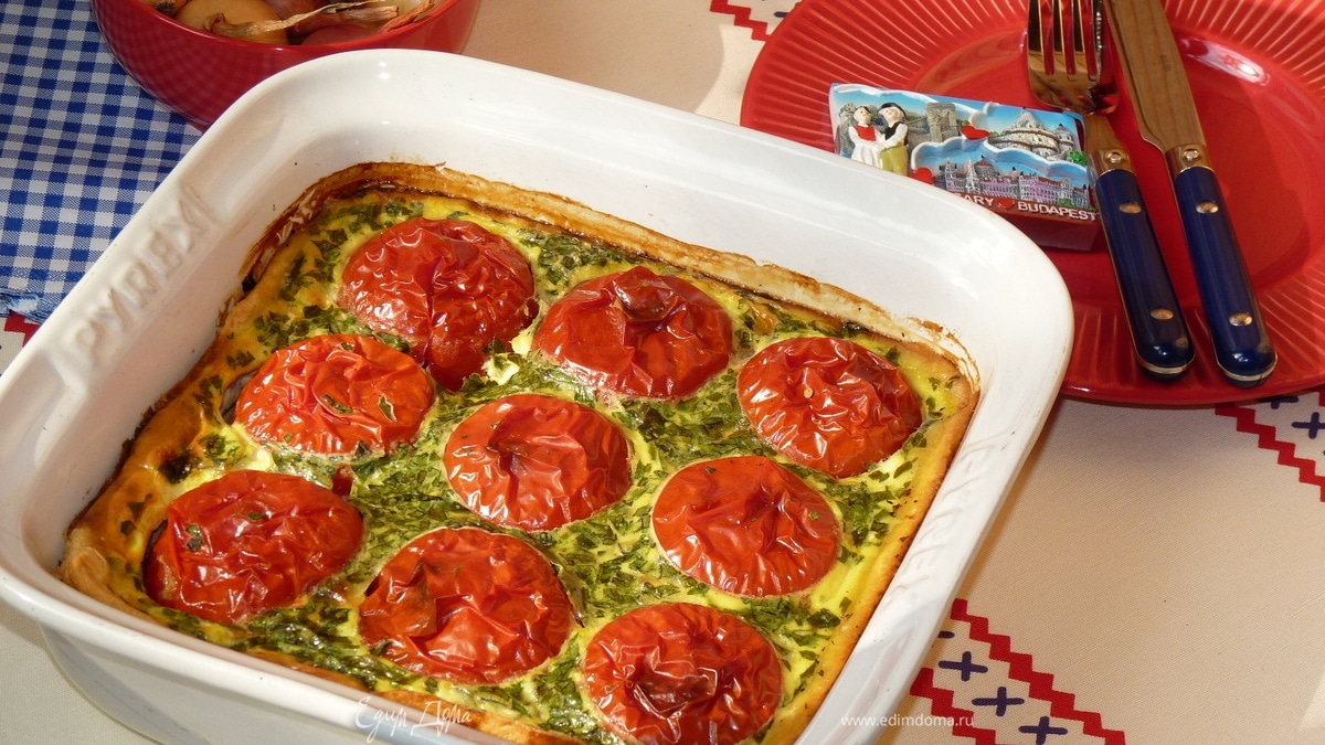 Открытый заливной пирог с фаршированными помидорами. Листая на даче старые кулинарные журналы, наткнулась на очень интересный, на мой взгляд, рецепт.
