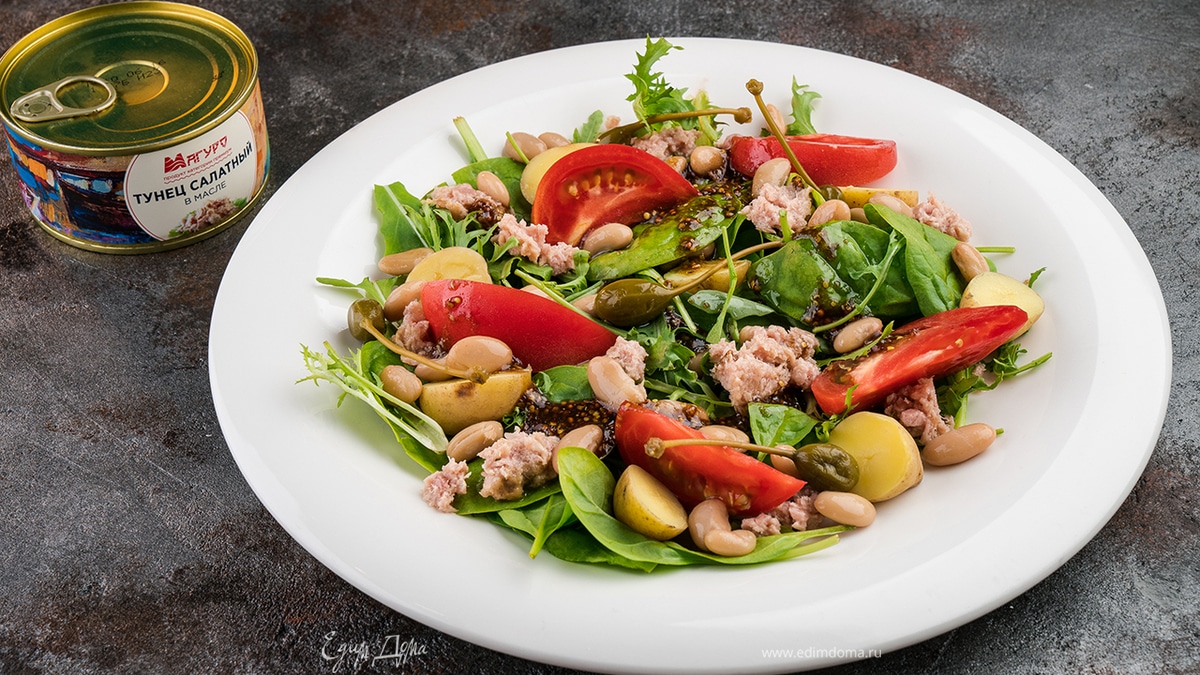Листья салата порвите уложите на дно блюда. В один слой на небольшом расстоянии друг от друга разместите кусочки картофеля. Консервированного тунца поломайте на кусочки, помидоры нарежьте дольками или кусочками. Добавьте фасоль, тунца и помидоры к остальным ингредиентам на блюдо. - Шаг 4
