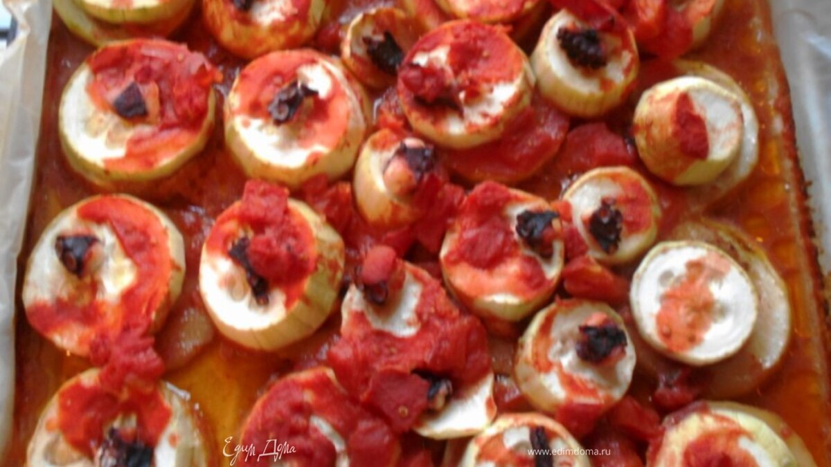 - Шаг 2Закрываем кружочками кабачка, кладем, если хочется, маленькие кусочки осьминога, поливаем помидорами (лучше кусочками очищенные), ставим в духовку на 200°С, запекаем, если нужна корочка, то подольше.