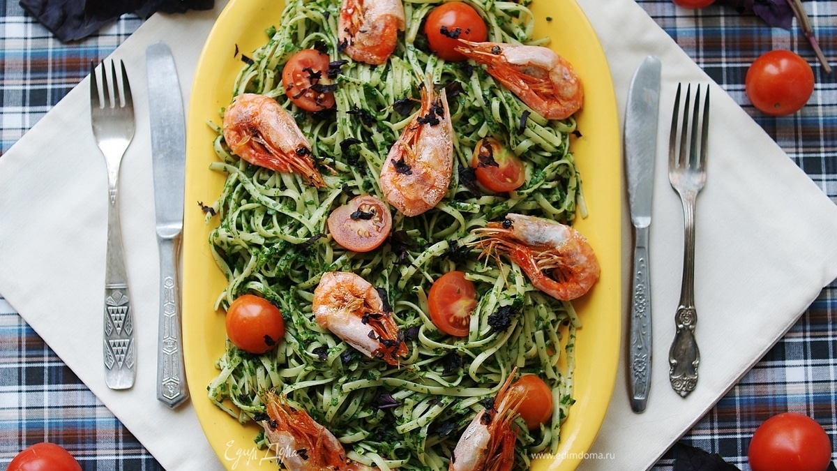 Паста со шпинатом и креветками