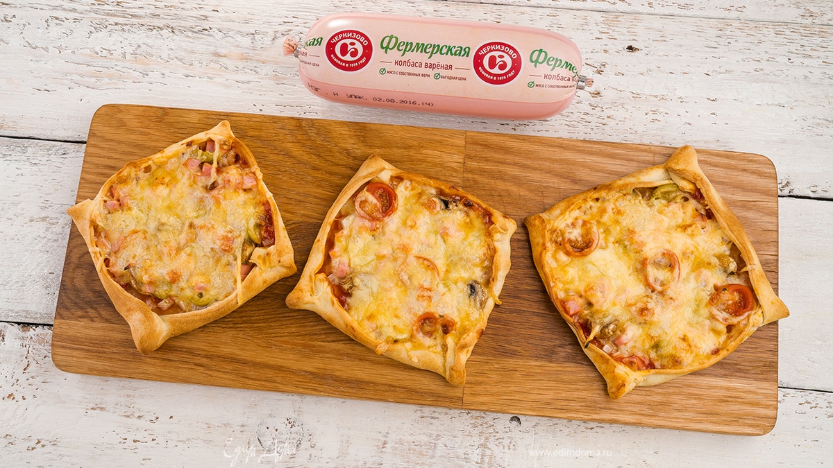 На рабочую поверхность слегка выложим муки, тесто и обминаем примерно 5 мин. Тесто должно быть эластичным и мягким. Раскатываем тесто, затем разрезаем на квадраты, должно выйти 6 квадратов. Каждый квадрат смазываем кетчупом или томатным соусом по центру, не задевая кончики краев. - Шаг 5